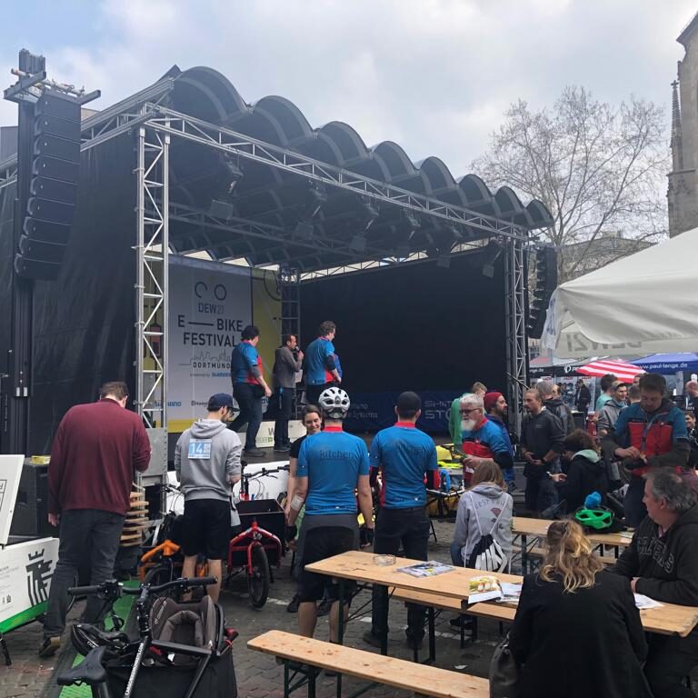 - Aufbau von zwei Bühnen (20×10 m und 10×8 m) mit Höhen zwischen 0,5 und 2 Metern sowie zwei Werbetürmen (4×4×12 m), beschwert mit je sechs Tonnen Gewicht.